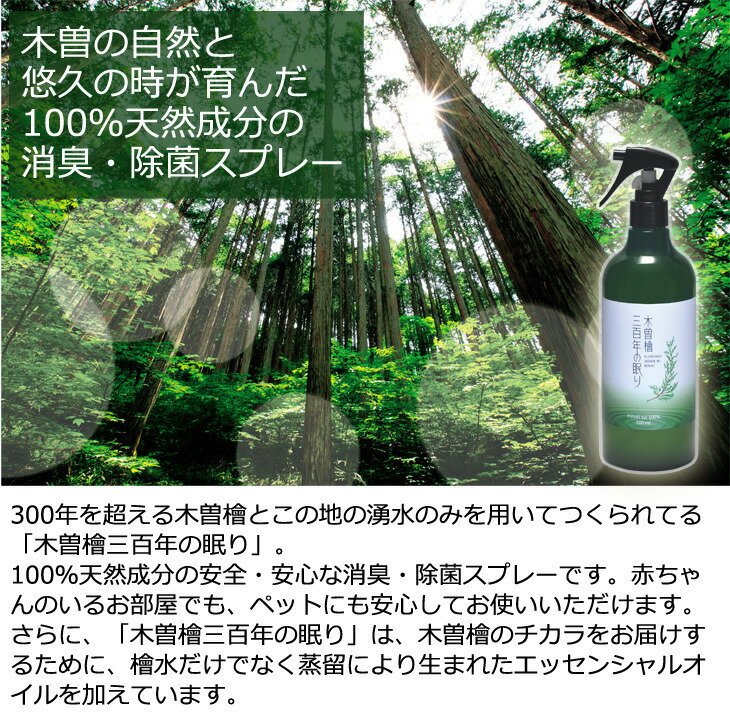 【335-000001-20】【KHS01】木曽檜三百年の眠り 消臭・除菌スプレー 500ml商品概要商品名木曽檜三百年の眠り 消臭・除菌スプレー 大ボトル 約500ml成 分木曽檜・天然湧水・精油(100%天然成分)内容量約 500ml仕 様木曽檜の天然成分で消臭・除菌するスプレーです。